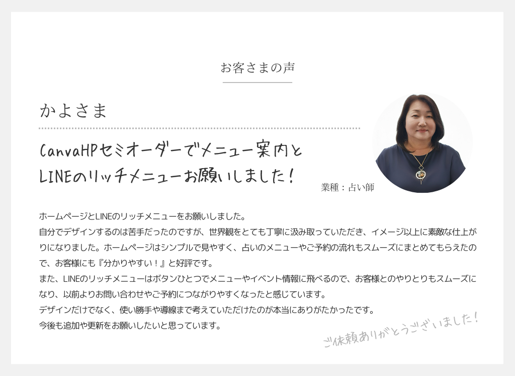 SNSとの相性がいいCanvaデザイン。初めてホームページを持つスモールビジネスの方から、実店舗お持ちの方まで幅広くご対応しております。