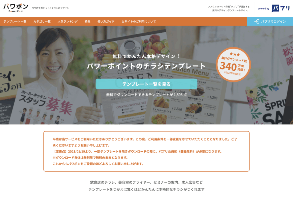 「パワポン」は、オフィス用品通販でおなじみの ASKUL(アスクル) が運営するネット印刷サービス「パプリ」が提供するテンプレートサイトです。