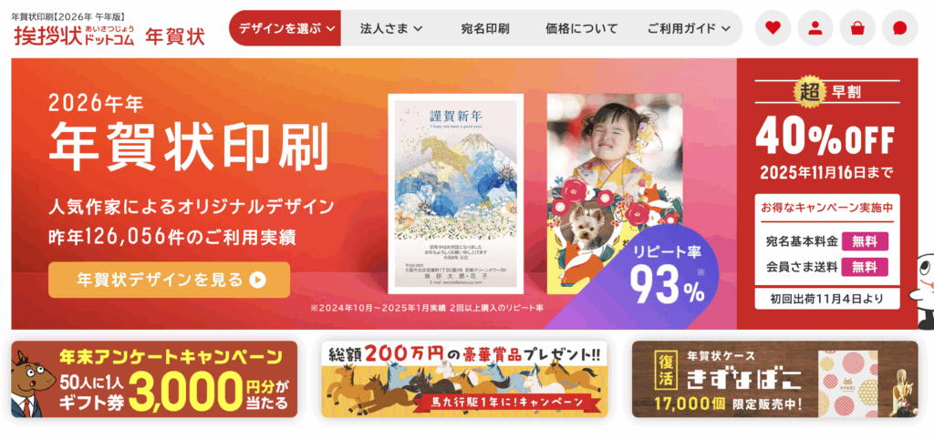 最大の魅力は、面倒な宛名印刷が完全無料なこと。印刷から投函準備まで、トータルで考えると非常にお得です。約1,000点の豊富なデザインに加え、年賀状を保管できる「きずなばこ」のプレゼントなど、独自の嬉しい特典も満載。手軽に、でも満足できる年賀状を作りたい方の強い味方です。