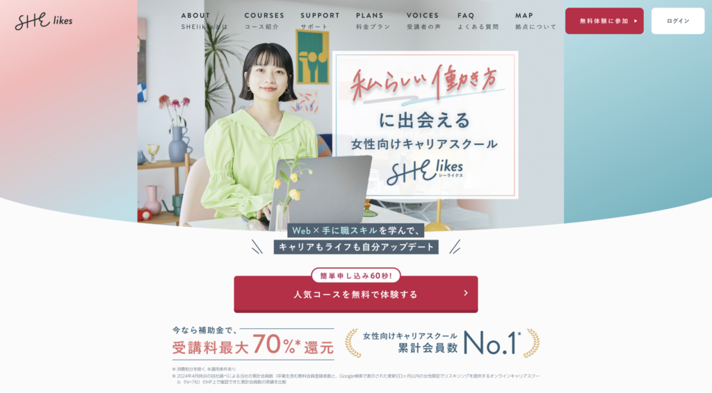 シーライクス(SHElikes)は、女性向けのオンラインキャリアスクールです。Webデザイン・マーケティング・ライティング・動画編集など、50以上のスキルが定額学び放題というスタイルが特徴です。