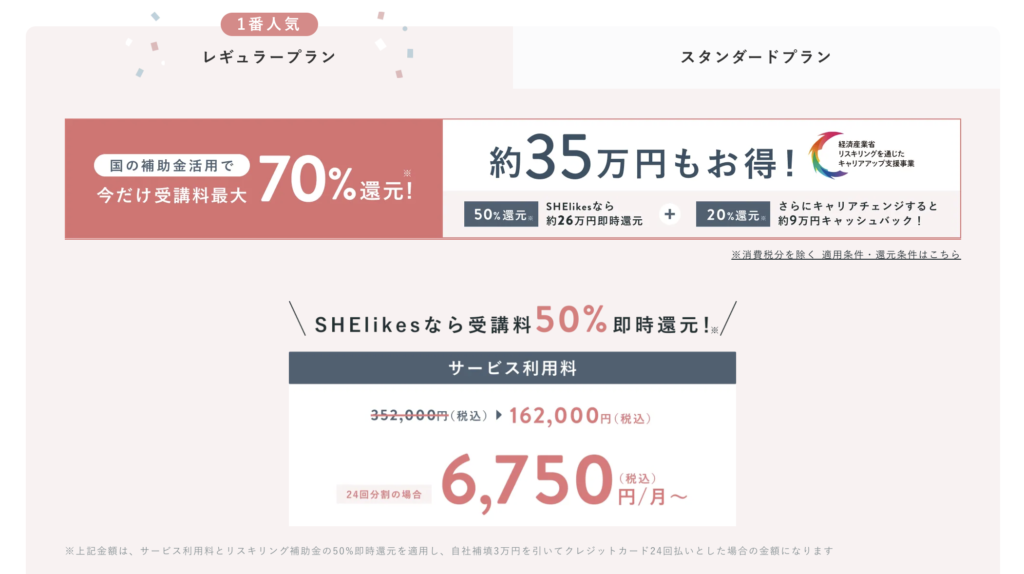 - レギュラープランは入会時に受講料50%が即時先取り還元。一時全額自己負担は不要